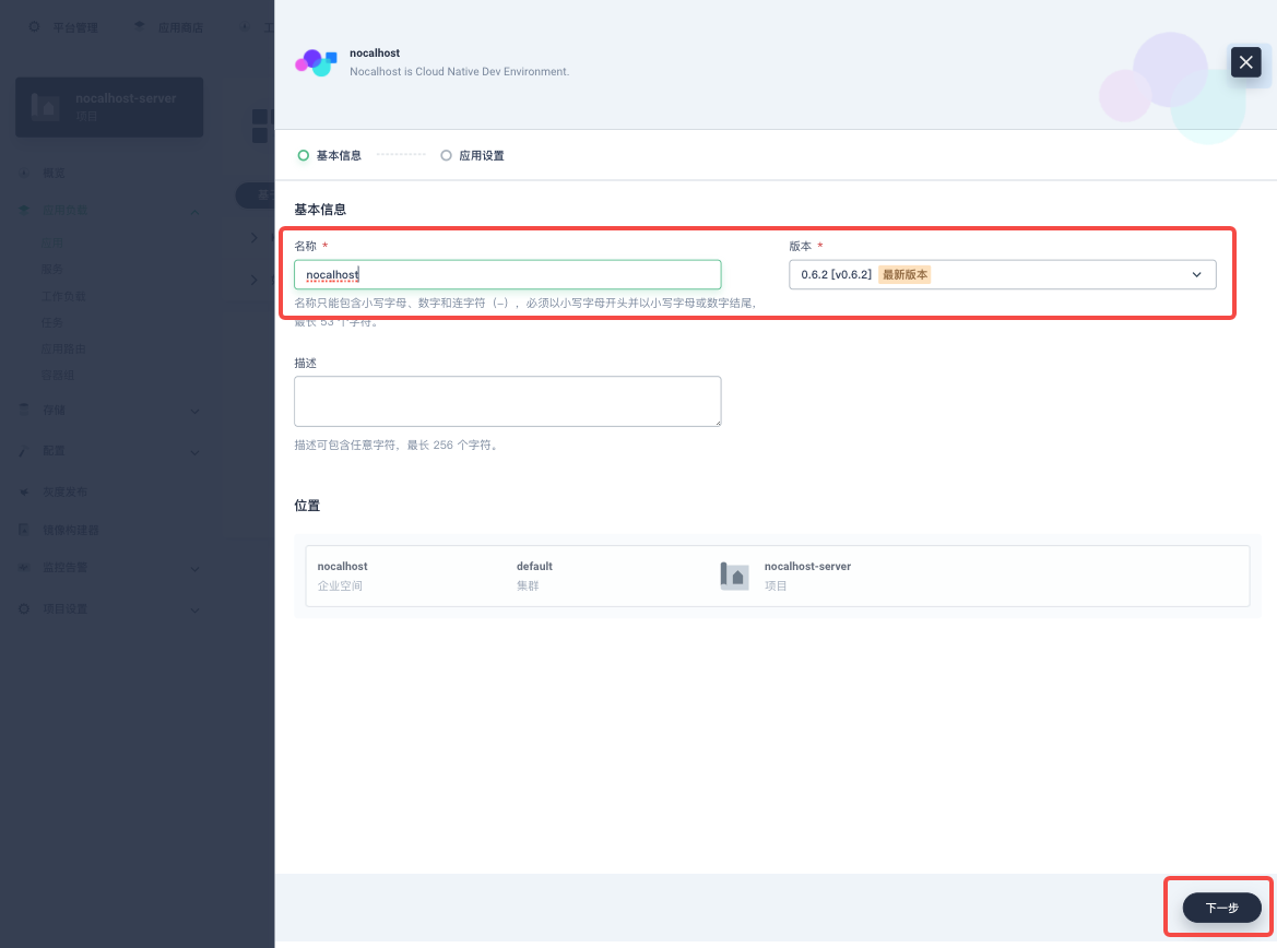 设置应用「名称」,确认应用「版本」和部署「位置」,点击「下一步」。
