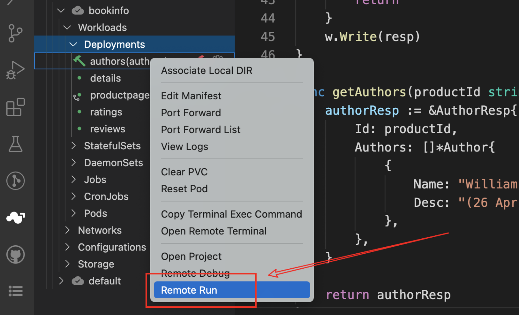 - 右键工作负载 authors,点击 Remote run,即可在远端容器里面运行在开发配置里面预设好的应用运行命令。