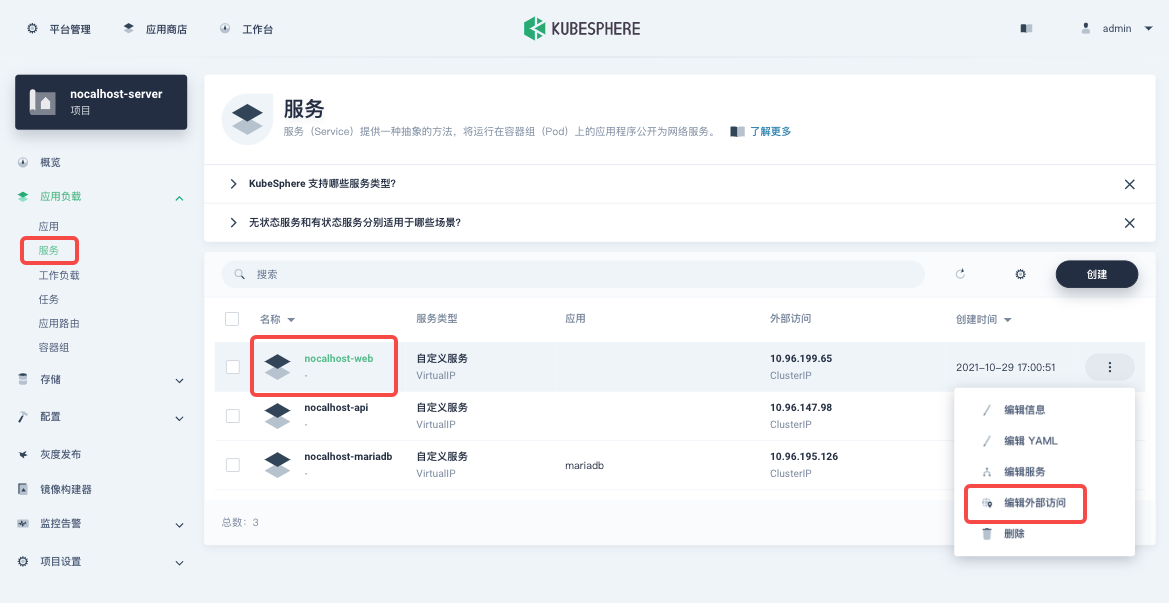进入「应用负载」下的「服务」页面,选择 nocalhost-web 服务,在最右侧的拉下菜单中选择「编辑外部访问」。