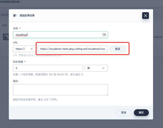 在弹出的对话框中,可将应用仓库名称设置为 nocalhost,将应用仓库的 URL 设置为 https://nocalhost-helm.pkg.coding.net/nocalhost/nocalhost,点击「验证」对 URL 进行验证,验证通过后再点击「确定」。
