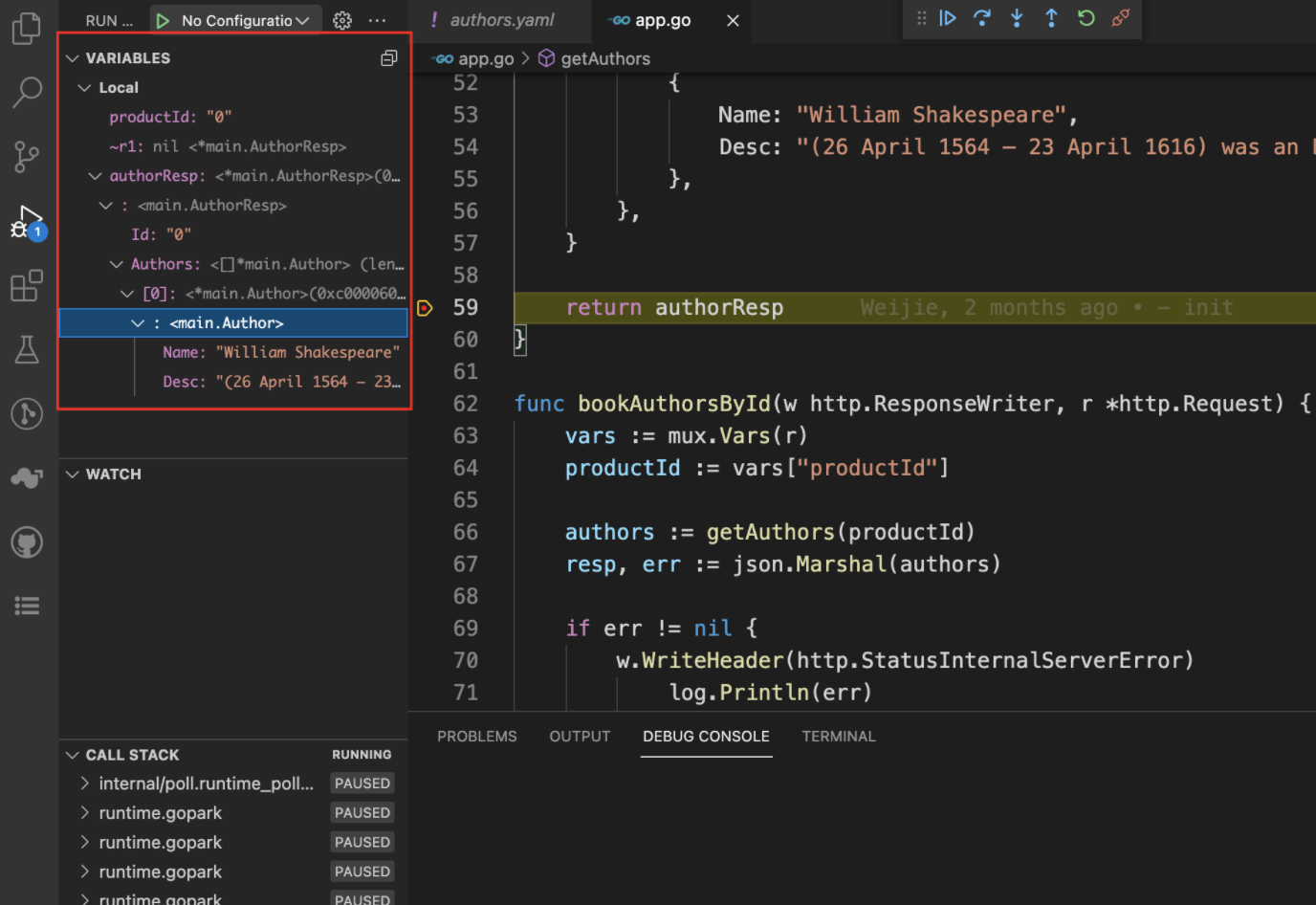 - 右键工作负载 authors,点击Remote debug,即可进入远程 debug 模式。