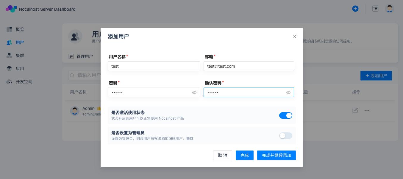 最后,我们创建一个样例用户来演示如果共享开发空间。进入到「用户」页面后,点击「添加用户」,在弹出的对话框中填入必须的用户信息后「完成」添加。
