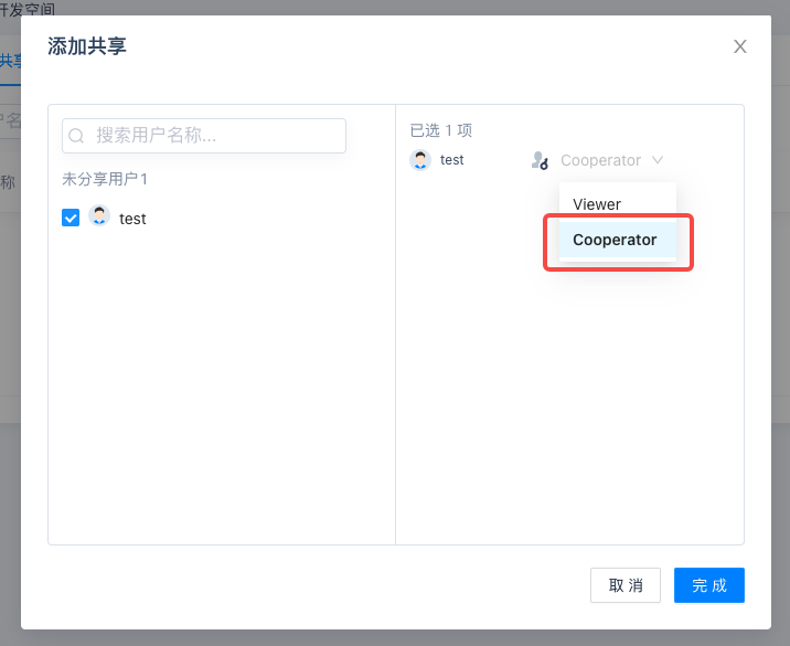 选择需要添加的用户,并注意选择默认的 Cooperator 协作者权限,另一个 Viewer 观察者权限的用户只能浏览开发空间。