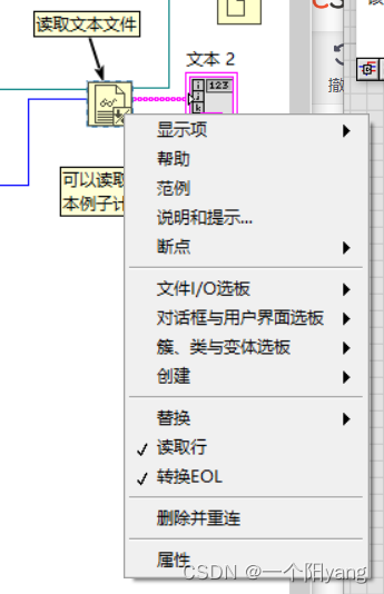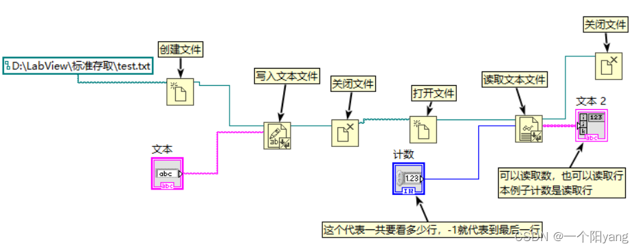 例子:这个例子的意思就是先创建一个文件,地址为:D:\LabView\标准存取\test.txt;然后写入文件,再打开文件,读取文件,可以对文本里的话来确定到底需要打印多少行来设置,最后在文本的显示控件里显示出来。