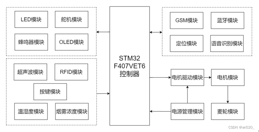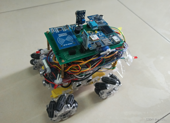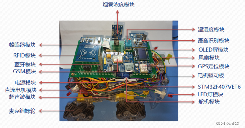 小车的硬件部分使用了以STM32F407VET6最小开发板为核心板,内部结合:温湿度模块、烟雾浓度模块、RFID模块、GSM模块、GPS定位模块、语音识别模块、超声波模块、蓝牙模块、OLED模块、舵机模块、电机驱动模块、电机模块、蜂鸣器模块、电压数码管显示模块和电源模块,外结合四个麦克纳姆轮,构成一个完整可靠的硬件系统。