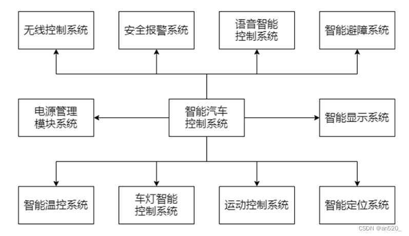 软件控制系统包括了智能显示系统、语音智能控制系统、无线控制系统、车灯智能控制系统、安全报警系统、智能避撞系统、智能温控系统和一键报警系统,在一定程度上提高汽车的安全性、控制性和防盗性。