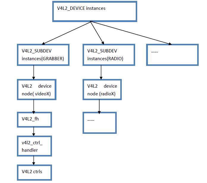 结构体v4l2_device、video_device、v4l2_subdev和v4l2_fh是搭建框架的主要元素。下图是V4L2框架的结构图: