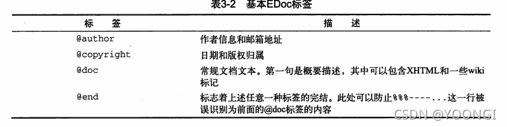 文件首部的文件级注释,每行注释以三个%开头,注释描述与的是关于整个文件的信息。注释中包括EDoc标注,EDoc可以直接通过源码标注生成文档。EDoc标签都以@开头,基本EDoc标签有: