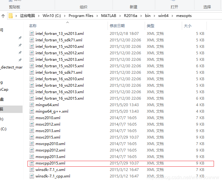 注意:Matlab2016支持的VS版本有兼容问题,matlab具体支持哪些VS版本请见matlab的安装文件夹路径:C:\Program Files\MATLAB\R2016a\bin\win64\mexopts 中包含了哪些编译器。如下图所示,我的文件夹中包含了vs2015,说明该版本的matlab支持vs2015的编译器。