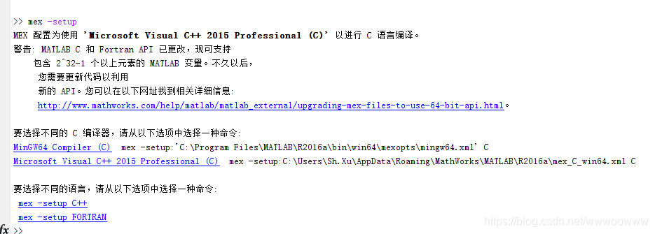 - matlab中使用mex -setup 命令,选择c++ 的编译器 (第一次可以使用mex setup -v ,先查找所有的已安装并且支持的编译器)