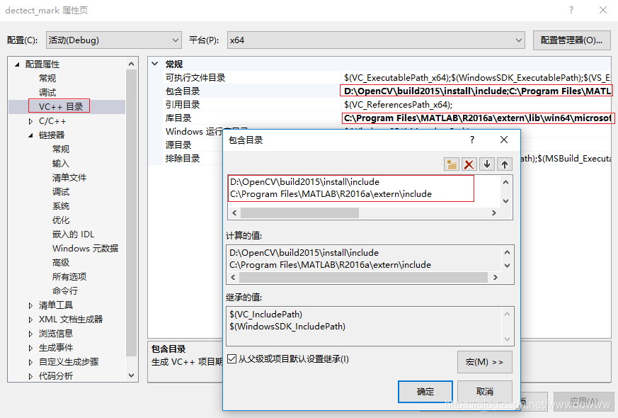 2.3.VC++目录-》 2.3.1包含目录:添加opencv的include, 添加matlab安装目录下的/extern/include目录