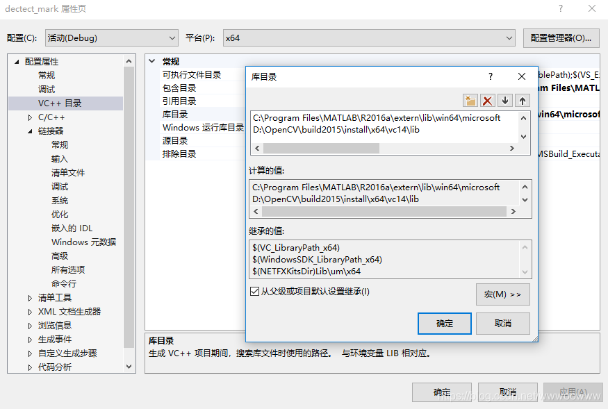 2.3.2 库目录:添加opencv的 x64\vc14\lib(这是我自己编译的基于vs2015的opencv库), 添加matlab安装目录下的\extern\lib\win64\microsoft目录