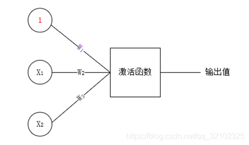 说明:1表示的是偏移值(类似于曲线中的常数);X1,X2表示的是初始特征值,简单点说就是输入的变量值;W1,W2,W3表示权重,就是变量的参数;特征值会首先会加权求和然后通过激活函数再最终输出。