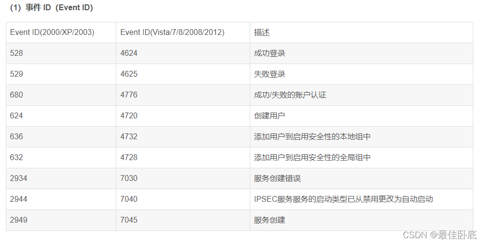 对于Windows事件日志分析,不同的EVENT ID代表了不同的意义,摘录一些常见的安全事件的说明。