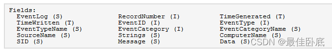 主要字段为:TimeGenerated:事件生成时间 EventID:事件ID EventType:事件类型 String: EventLog ComputerName:计算机名称