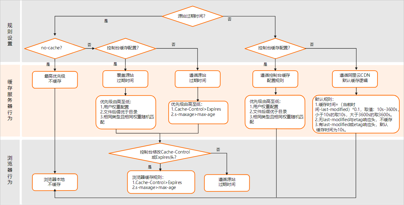 阿里云CDN默认的缓存策略就是利用这个last-modified,利用当前时间减去最后修改时间乘以0.1,来作为默认的缓存时间,最大缓存时间为3600s,也就是1个小时,我本人觉得1个小时的缓存时间刚刚好,也不用去配置可以直接用。