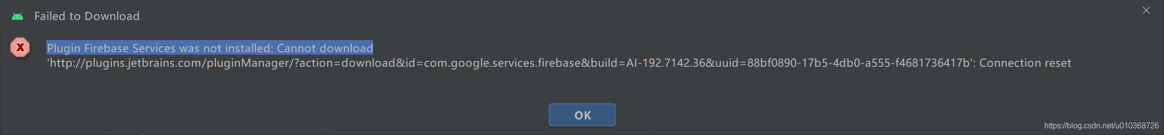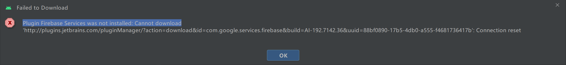 目前用的是android studio最新版3.6.2,每次打开AS都提示firebase插件要更新,而且更新一直更新不了,提示界面如下: