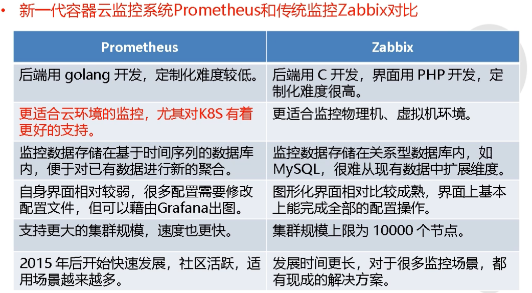 多维数据模型:普罗米修斯它承载了数据持久化用的中间件。内置时间序列数据库:基于时间序列存储的,内置时间序列数据库:TSDB,并非关系型数据库(mysql)形式的二维表,类似于非关系型数据(mongodb)json格式,所以没有行跟列的说法。但是多维数据模型大致可以理解为关系型数据库中列很多,一维代表一列,可以用不同的维度(列),对存储的数据查询跟索引。不同的查询检索,跟不同的过滤条件去查到我想要的监控的信息。注:查询到的不是真正的监控的指标,而是度量名,也就是查询到的不是一个数值,而是一个函数。为什么使用TSDB:因为对于监控而言,不需要强制要求数据一致性,监控软件针对数据严谨性并不是高要求,丢一条两条无所谓,所以传统的zabbix选择数据库(mysql)已经过时,应该使用非关系型数据库。而且监控软件针对时间很重要,所以选择时间序列数据库:TSDB,可以选择其他的时间序列数据库。 promQL:普罗米修斯提供一种标准的查询语言,名字叫 promQL,类似如sql(结构化查询语言),不同的是promQL语言拥有复杂的一堆的聚合、模型等。普罗米修斯跟zabbix区别:普罗米修斯跟zabbix采集方式略有不同。zabbix分主动跟被动方式,分为服务端和代理节点,代理节点中可以通过脚本获取任何想要的信息,在通过zabbix客户端推送给服务端即可。但普罗米修斯默认只能跟被监软件件基于HTTP或者HTTPS拉取的方式通讯。普罗米修斯采集:有些服务不使用http/https接口如何通信,需要从官网下载指定的exporter,由exporter跟你的内部指定的被监控软件进行通讯,比如MySQL的exporter,MySQL的exporter安装并配置mysql的连接串,进而通过TCP sock跟mysql通信,然后由exporter暴露HTTP或者HTTPS接口,普罗米修斯就可以抓了。支持PushGateway:默认普罗米修斯基于http/https协议去向exporter拉取数据,但也支持PushGateway(推),exporter携带监控数据主动推给普罗米修斯。什么时候用推,有一个特定的使用场景(假如监控的目标是一个转瞬即逝的任务,比如一个jobs,在某天执行一次,0.1s执行完,由于时间间隔太短,普罗米修斯拉取不到。这种情况需要用PushGateway主动推)。通过服务发现或静态配置发现代理端exporter进行目标收集数据:两种发现目标的方式,一种叫服务发现一种叫静态配置,静态配置容易一些,但是用的少。支持做为数据源接入Grafana:Grafana仪表盘