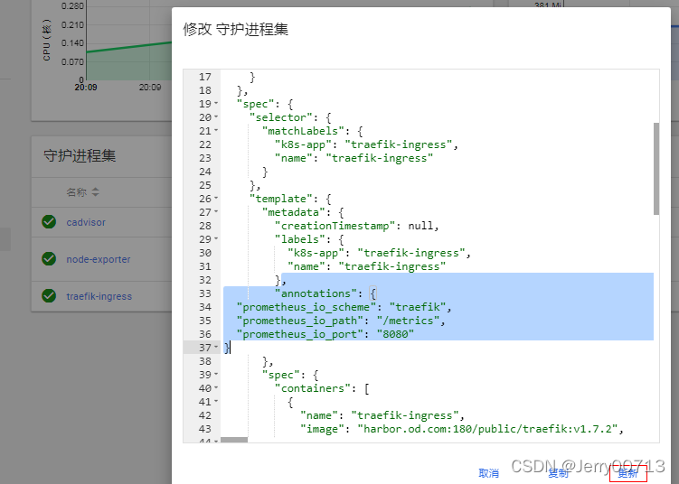 然后重启promenteus,但是生产环境下不要删除promenteus的pod,因为太大,启动时间太长,还容易给集群拖垮。查看promenteus的pod部署在那个node,之前我们配置promenteus运行在hdss7-21上,所以找到promenteus的pid,由于promenteus支持配置文件修改后,平滑加载。然后kill -SIGHUP 就实现平滑加载。其中SIGHUP传递信号