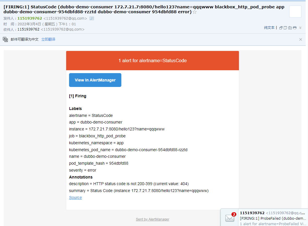 把dubbo-demo-service 停止,dubbo-demo-consumer一定是报错,然后触发报警