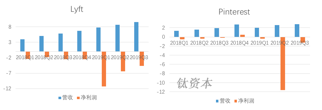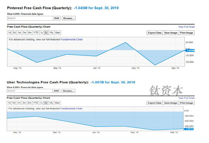 上图是Pinterest和Uber的自由现金流情况。Pinterest绝大部分时间的自由现金流都是负数而且这个规模还在扩大,Uber的情况其实看起来比WeWork更加严重。