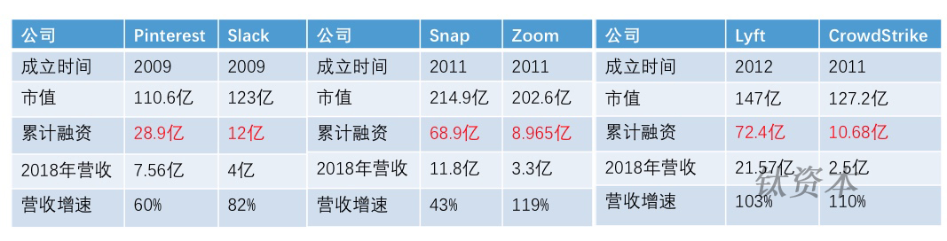第二组数据。成立于2011年的Snap和Zoom,市值分别是214.9亿美元和202.6亿美元,累计融资金额分别是68.9亿美元和8.965亿美元,它们之间的倍数也相差了7.7倍。