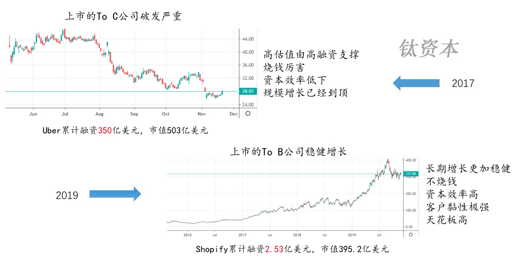 2019年,风向从高估值高融资的ToC互联网公司转向了企业服务公司,ToB公司长期增长更加稳健不烧钱,资本效率极高,客户黏性很强,同时天花板也很高。所以上图第二张图中可以看到,Shopify累计融资金额是2.53亿美元,但是市值目前已经接近了400亿美元。