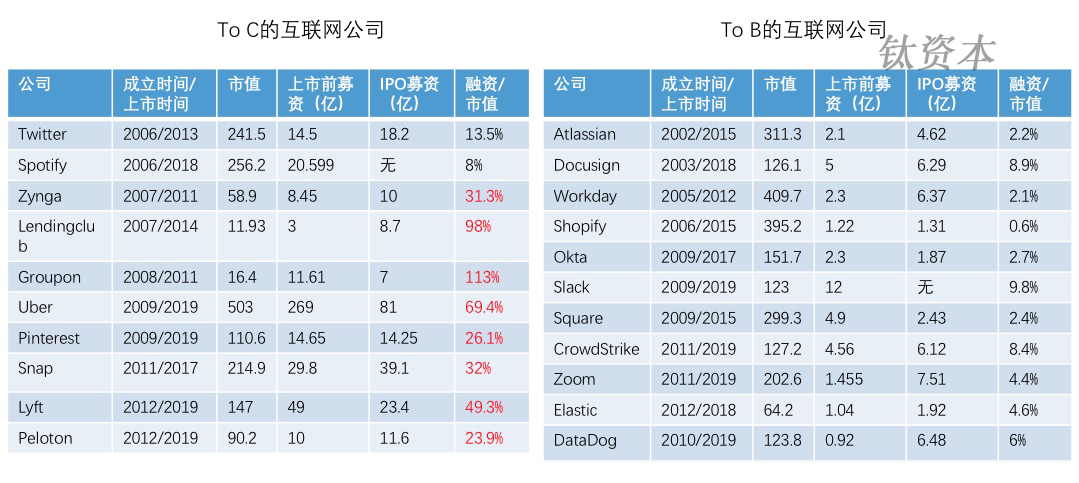 首先,放在同样资本市场里进行对比。上图左边是美国著名的ToC上市公司, 其中Twitter、Uber、Pinterest、Snap、Lyft作为行业的头部公司,市值都在一百亿美金以上,累计的融资金额基本都在30亿美金以上。看融资和市值的比值,除了Twitter和Spotify的稍微低一点之外,其它的基本都在20%以上,最高的甚至超过了100%。而在上图右边的11家ToB公司里,包括今年刚刚上市的DataDog以及今年大红大紫的Slack、Zoom,累计融资金额超过10亿美金的只有三家,而且融资和市值的比值没有一家超过10%,最低的Shopify甚至低到了0.6%。