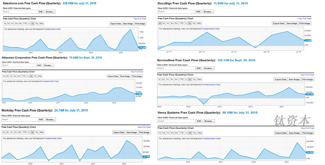 上图列举了几家行业领导地位的企业服务公司的自由现金流情况。Salesforce从2007年以来的13年、50个季度,只有两个季度的自由现金流是负数, 2014年9月的自由现金流高达18亿美金。Workday从2014年以来的6年,绝大部分时候自由现金流都是正数,Veeva在7年以来,绝大部分时间自由现金流都是正的。还有Atlassian从2014年以来的6年,每一个季度自由现金流都是正数。这些公司共同的特点是随着时间的推移,自由现金流的金额越来越高。