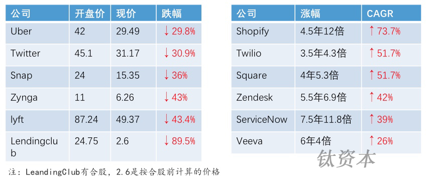 还有一个原因,SaaS类企业服务公司的模式其实非常相似,有很多指标和工具能够用来衡量公司的好坏,也就是价值很容易量化。对于二级市场投资人来讲,降低了判断和投资的门槛,导致了资金的快速集中。从图中可以看到,在二级市场里的表现,ToC公司的股价基本都是破发,下跌基本都超过30%,而这些ToB公司基本上都在四到五年,以五到六倍的速度高速增长,体现了非常高的CAGR值(年复合增长率)。