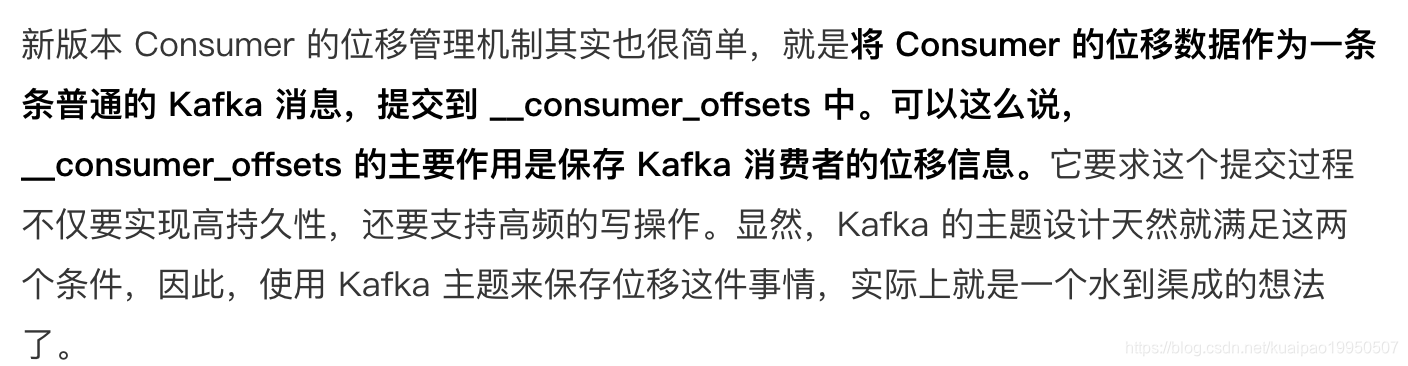 但是,ZooKeeper 其实并不适用于这种高频的写操作,因此,Kafka 社区自 0.8.2.x 版本开始,就在酝酿修改这种设计,并最终在新版本 Consumer 中正式推出了全新的位移管理机制,自然也包括这个新的位移主题