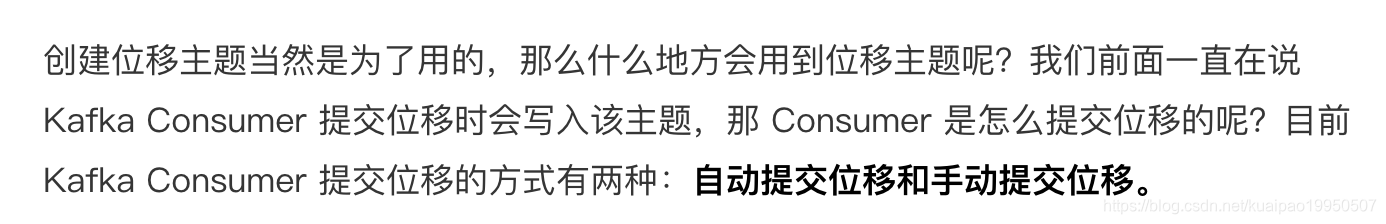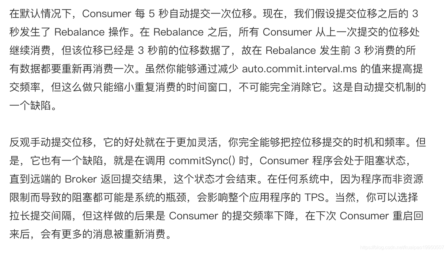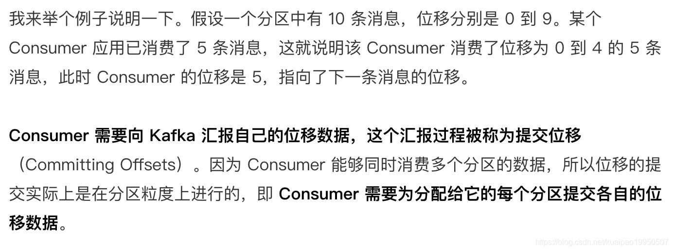 提交位移主要是为了表征 Consumer 的消费进度,这样当 Consumer 发生故障重启之后,就能够从 Kafka 中读取之前提交的位移值,然后从相应的位移处继续消费,从而避免整个消费过程重来一遍。换句话说,位移提交是 Kafka 提供给你的一个工具或语义保障,你负责维持这个语义保障,即如果你提交了位移 X,那么 Kafka 会认为所有位移值小于 X 的消息你都已经成功消费了