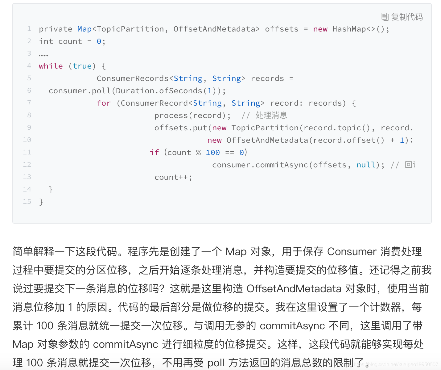 调用 commitAsync() 之后,它会立即返回,不会阻塞,因此不会影响 Consumer 应用的 TPS。由于它是异步的,Kafka 提供了回调函数(callback),供你实现提交之后的逻辑,比如记录日志或处理异常等;