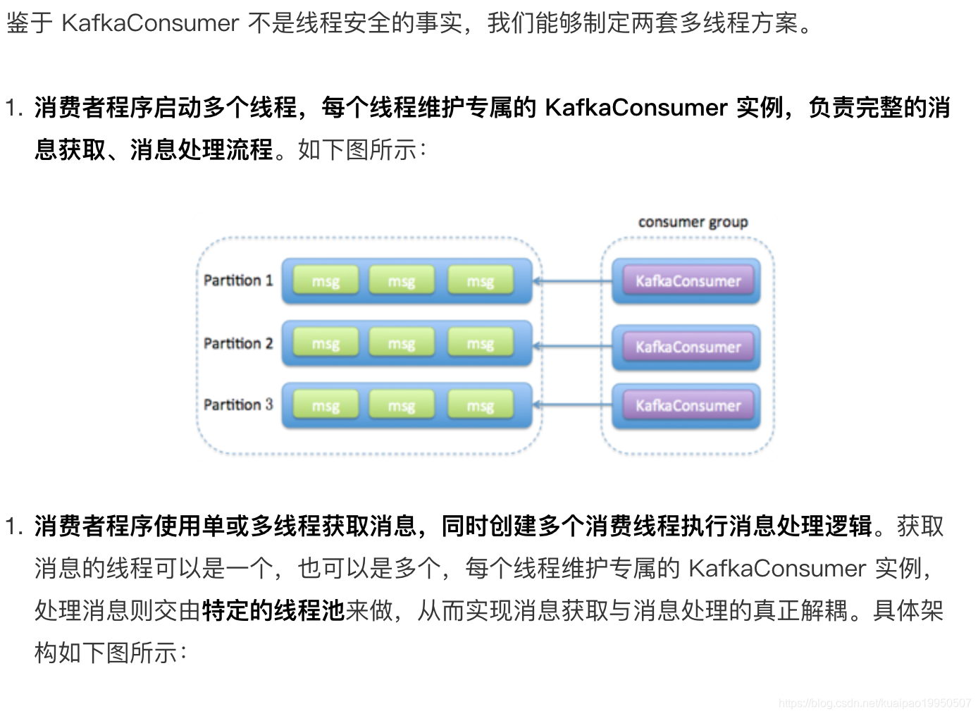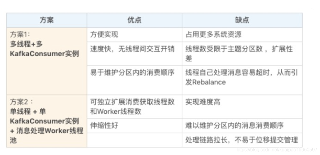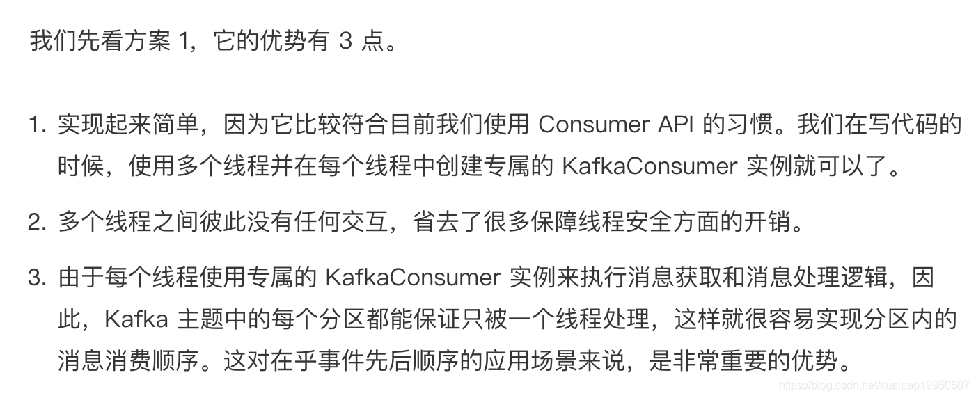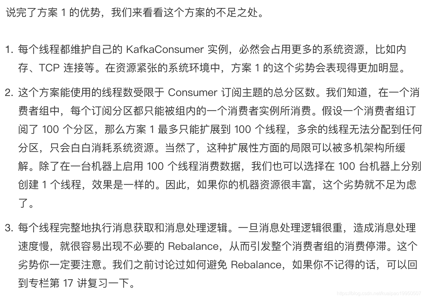 我们来打个比方。比如一个完整的消费者应用程序要做的事情是 1、2、3、4、5,那么方案 1 的思路是粗粒度化的工作划分,也就是说方案 1 会创建多个线程,每个线程完整地执行 1、2、3、4、5,以实现并行处理的目标,它不会进一步分割具体的子任务;而方案 2 则更细粒度化,它会将 1、2 分割出来,用单线程(也可以是多线程)来做,对于 3、4、5,则用另外的多个线程来做。