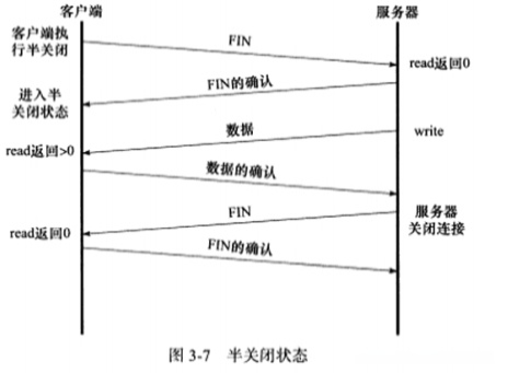 TCP连接是全双工的,所以允许两个方向的数据传输独立关闭。换句话说,通信的一端可以向对方发送报文段,告诉对方数据的发送已经完成,但允许对方继续接收数据,直到对方发送结束的报文段关闭连接。TCP连接的这种状态称为半关闭状态,如下图3-7所示。