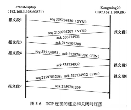 后四个TCP报文段是关闭连接的过程。第四个TCP报文段包含FIN标志,所以是结束报文段,即emest-laptop要求关闭连接。结束报文段和同步报文段一样,也要占用序号值。Kongming20使用TCP报文段5来确认结束报文段。然后Kongming20发送自己的结束报文段6,ernest-laptop用TCP报文段7确认。事实上,仅用于确认目的的确认报文段5是可以省略的,因为结束报文段6也携带了确认信息。确认报文段5是否出现在连接断开的过程中,取决于TCP延迟确认的特点。延迟确认将在后面讨论。