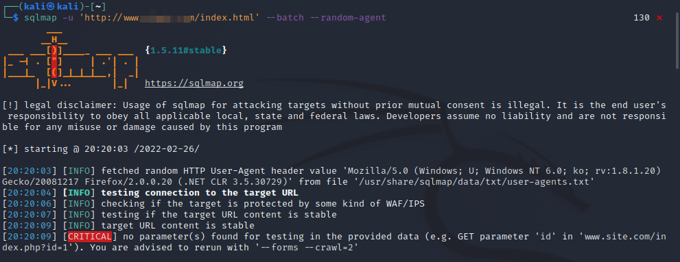 sqlmap -u 'http://www.xxxxx.com/index.html' --batch --random-agent