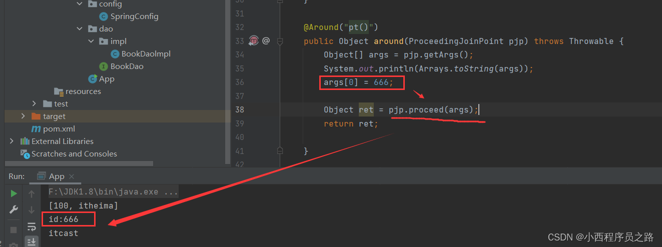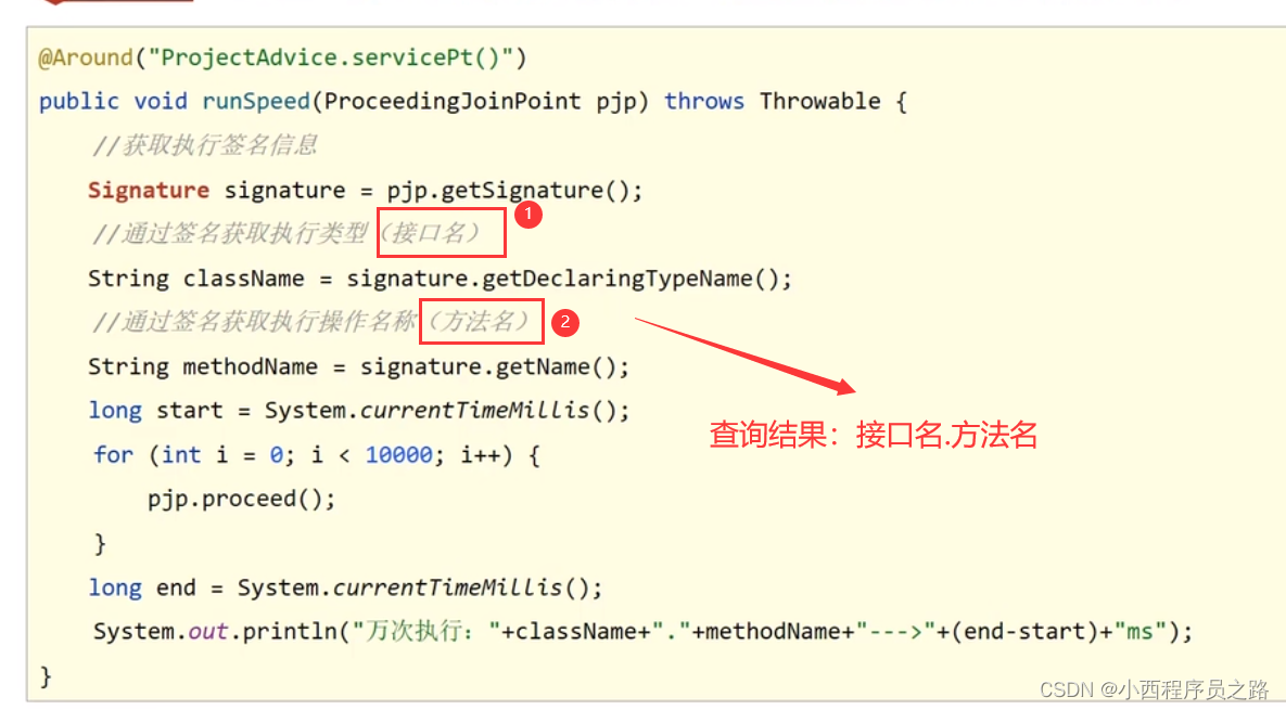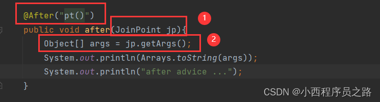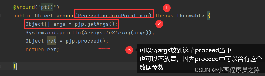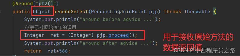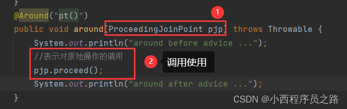 3、@Around("pt()"):在接入点前后发布,环绕控制。不过在使用环绕注解是,需要进行对谁前和谁后进行一个标识调用。操作如下:。注:如果不添加这个步骤的处理,则会出现将原始操作进行隔离。