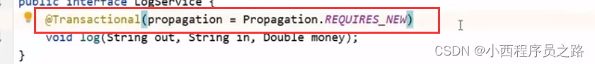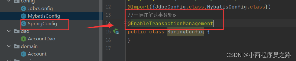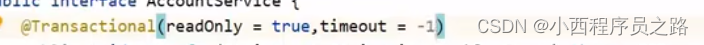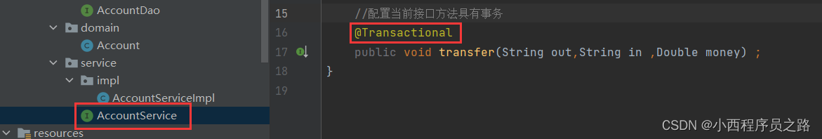 步骤一:AccountService接口中配置。开启事务。在服务端的接口处添加:注解@Transactional:表示开启事务
