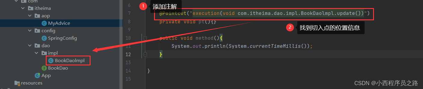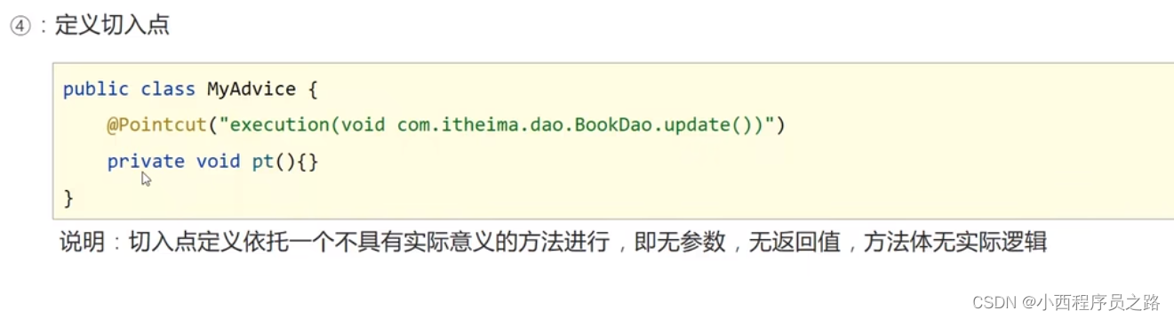 步骤四:创建切点注解@Pointcut(“找到需要的接入点的位置描述”)
