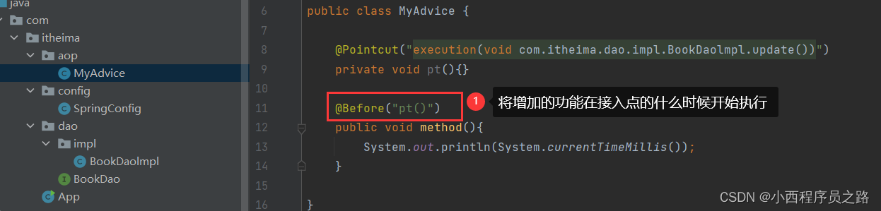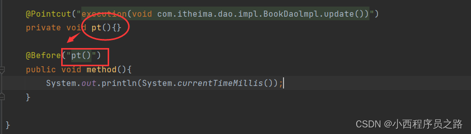 1、@Before("pt()"):在接入点之前发布