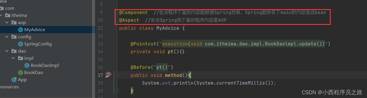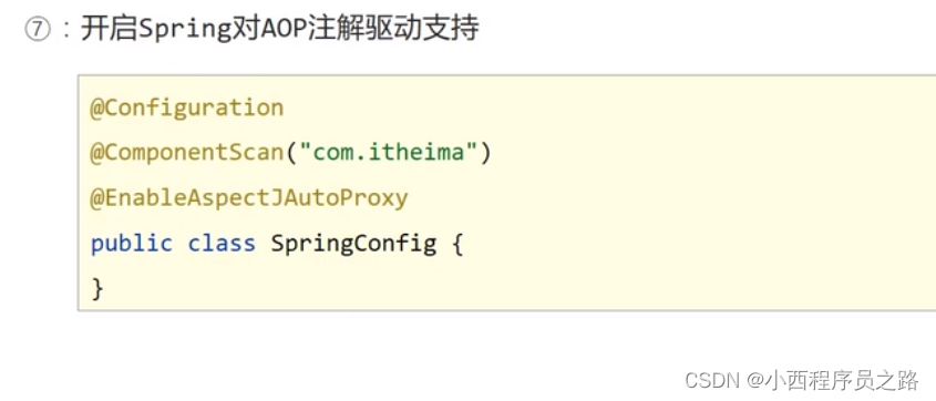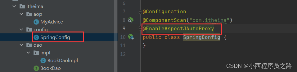 在SpringConfig中需要添加@EnableAspectJAutoProxy:告诉配置程序当中存在考注解开发的AOP,在本文中就是激活在通知类中Aspect。