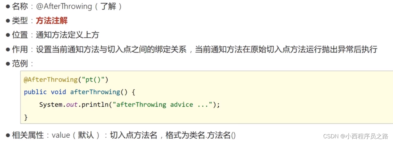 5、@AfterThrowing("pt2()"):出现异常该注解才执行