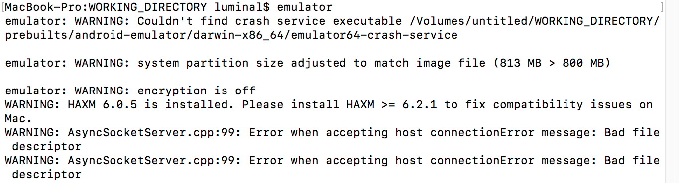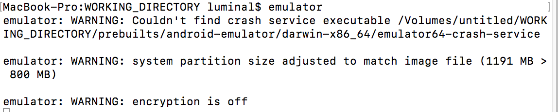 emulator: WARNING: Couldn't find crash service executable /Volumes/untitled/WORKING_DIRECTORY/prebuilts/android-emulator/darwin-x86_64/emulator64-crash-service