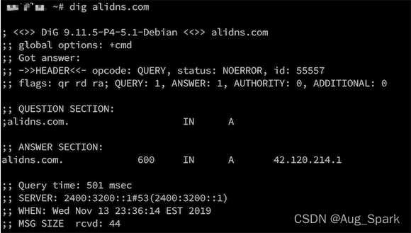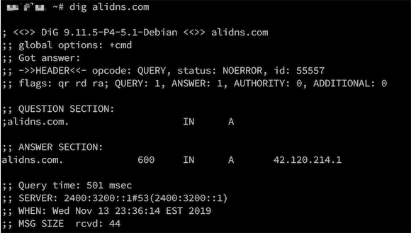 dig alidns.com若返回结果的server为阿里公共DNS(2400:3200::1或2400:3200:baba::1)则配置成功。