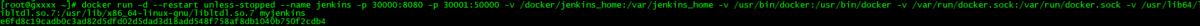 docker run -d --restart unless-stopped --name jenkins -p 30000:8080 -p 30001:50000 -v /docker/jenkins_home:/var/jenkins_home -v /usr/bin/docker:/usr/bin/docker -v /var/run/docker.sock:/var/run/docker.sock -v /usr/lib64/libltdl.so.7:/usr/lib/x86_64-linux-gnu/libltdl.so.7 myjenkins