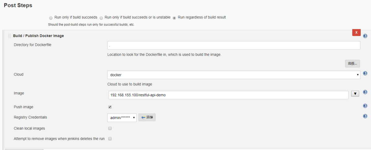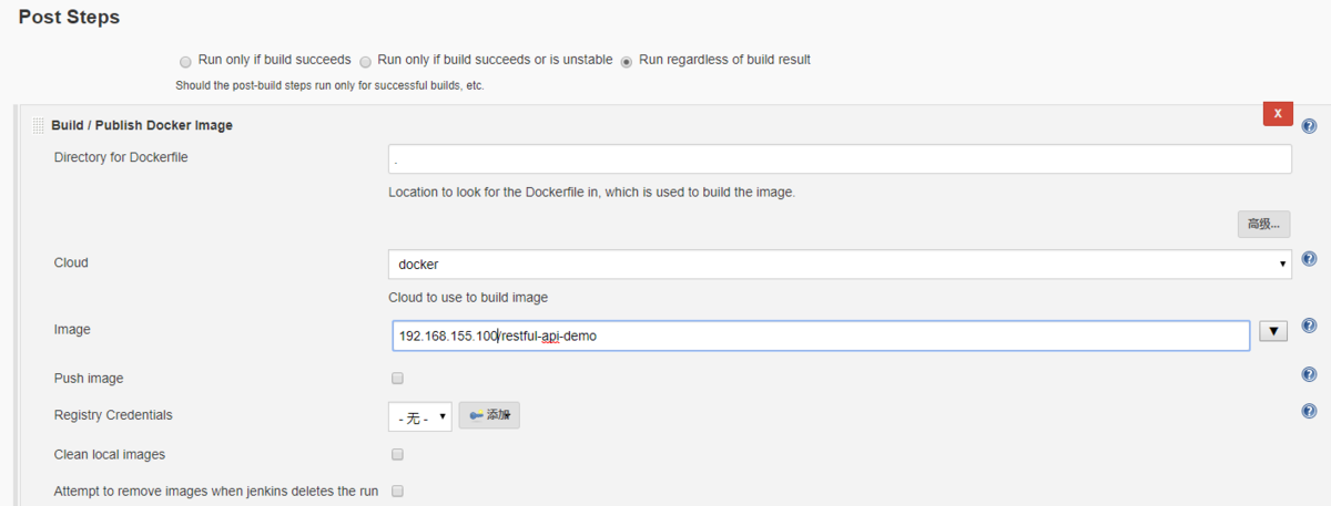 在Post Steps里添加一个Build/Publish Docker Image选项,Directory for Dockerfile填写. (就一个点),Cloud选择先前添加docker云配置的名称,然后输入镜像名192.168.155.100/restful-api-demo