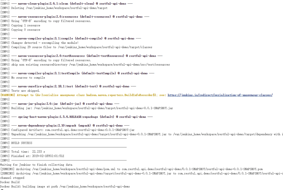 配置好后,再次构建任务,最后就能看到项目成功的上传到了docker私服中。